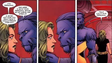 the story didn’t end with them losing kitty pride. they showed what went after. the beast hanging out with agent brand who confessed she has the hots for him. wolverine drunk as ever but got a new apprentice by the name of armor. cyclops, in control of his eyebeams, but decided it’s time to return back to normal and says “i love you” to his girlfriend, emma frost.